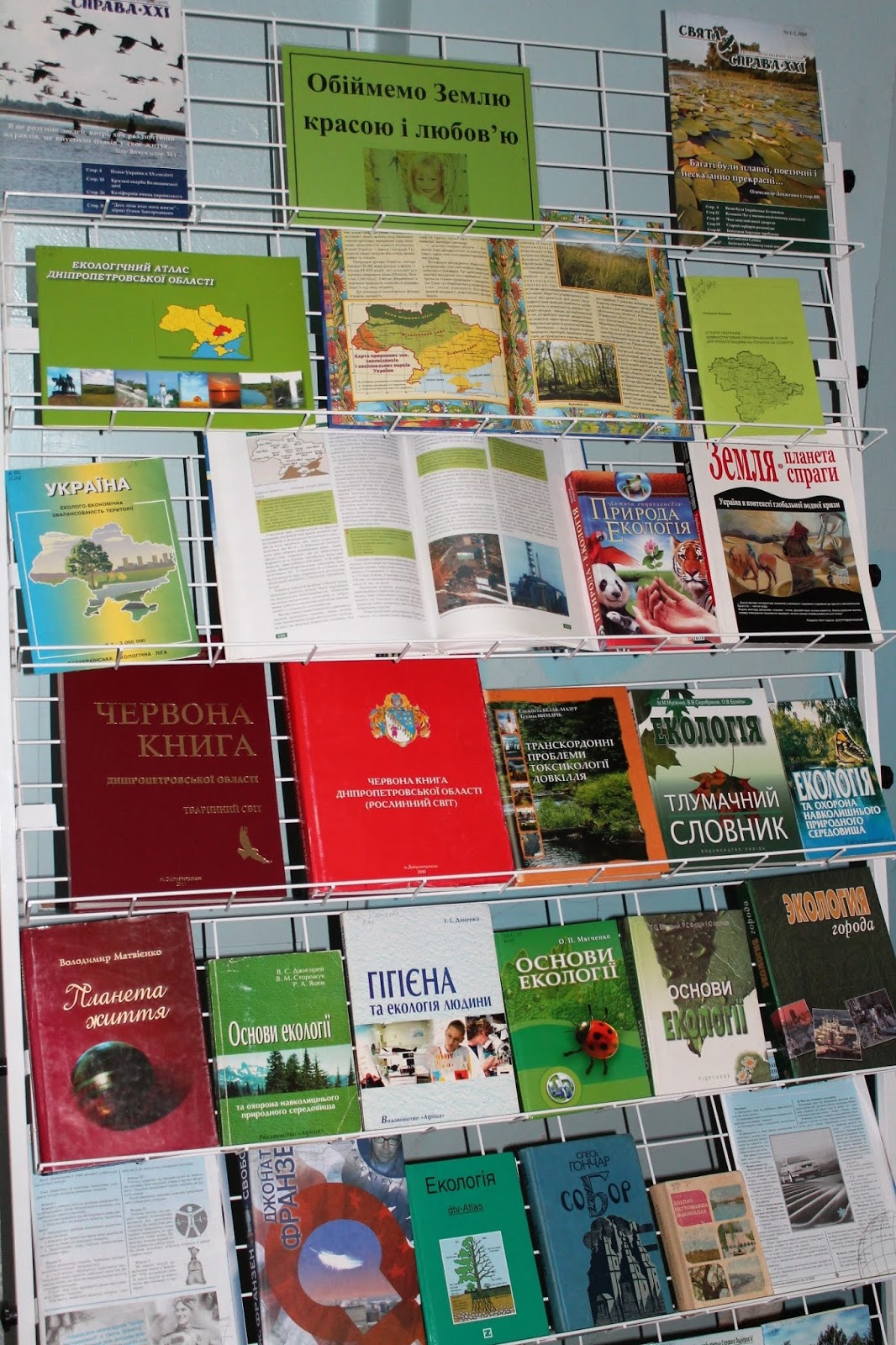 До Всесвітнього дня охорони навколишнього середовища у читальній залі Марганецької центральної міської бібліотеки оформлено книжкову виставку-застереження «Обіймемо Землю красою і любов’ю», яка знайомить користувачів з літературою про екологічні проблеми у світі, про безпосередній зв’язок людини з природою.