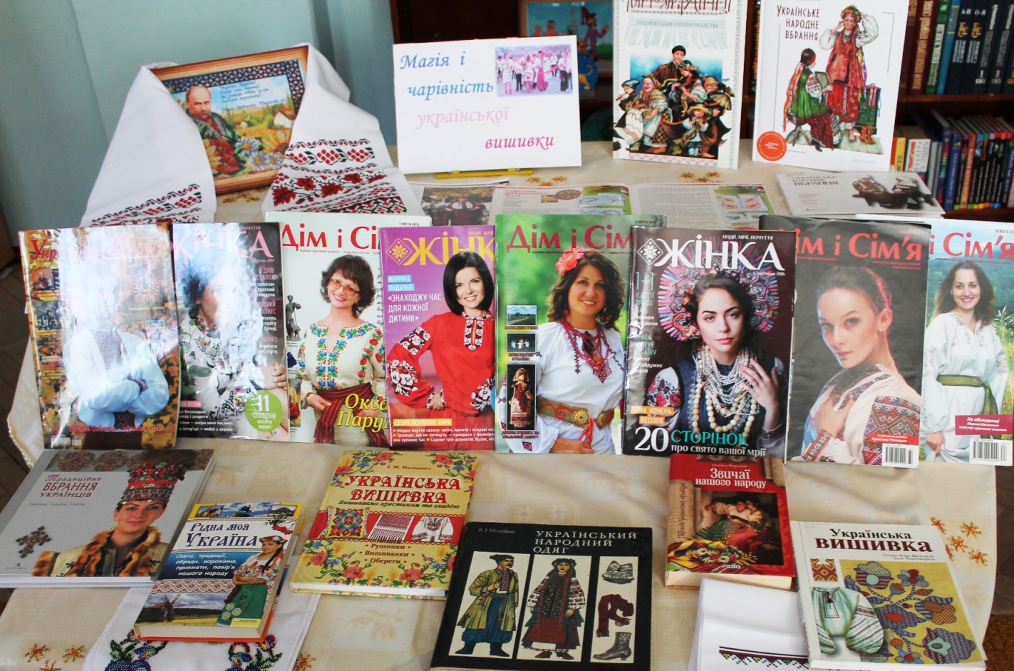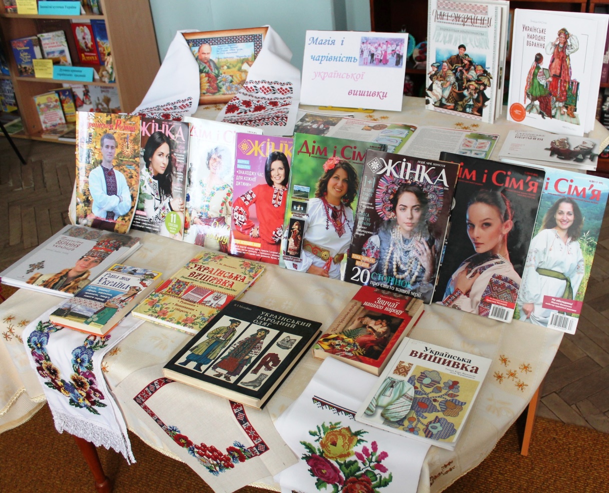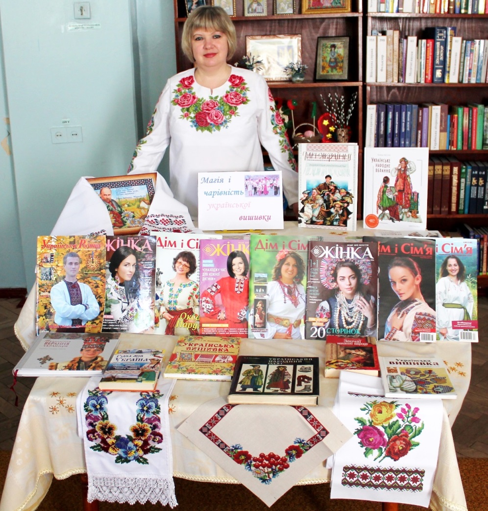 Книжкові скарби нашої бібліотеки розкривають відновлення національної пам’яті, знайомлять з традиціями створення і носіння вишиванок, сучасними тенденціями в їх оздобленні, з історією української вишивки, народними звичаями та обрядами, пов’язаними з нею. Завітавши на виставку, ви зможете ознайомитись з історією українського костюму, технікою вишивки сорочок. Прикрасою експозиції є роботи майстрині Ольги Шаляпіної, працівниці бібліотеки. До речі, на фото майстриня у власноруч вишитій сорочці.