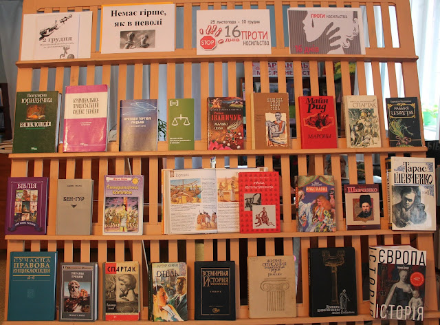 В рамках проведення щорічної Всеукраїнської акції «16 днів проти насильства» до Міжнародного дня боротьби за скасування рабства бібліотекарі читальної зали Вікторія Фіалковська та Ірина Мащенко оформили книжкову виставку «Немає гірше, як в неволі», яка знайомить з літературою про рабство у Стародавньому світі; про трансатлантичну торгівлю, яка тривала з XVI по XIX ст. і жертвами якої стали понад 15 млн. людей; про турецьку неволю та кріпацтво, в тому числі й книги про невольницькі роки Тараса Шевченка, чиї слова і стали назвою виставки: з 47 років життя поет перебував 24 роки у кріпацтві і 10 — на засланні.