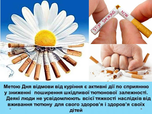 Міжнародний день відмови від паління (No Smoking Day) – відзначають щорічно у третій четвер листопада в більшості країн світу. Він встановлений Американським онкологічним товариством в 1977 році після того, як було визнано згубний вплив куріння на організм людини та здатність регулярного куріння провокувати розвиток раку.