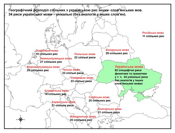 З точки зору лексики найближчою до української мови є білоруська (84% спільної лексики), потім польська (70%), словацька (68%), і лише на четвертому місці — російська (62%). Якщо ж говорити про фонетичні та граматичні риси, то найбільше спільних рис в української з верхньолужицькою та білоруською (29 спільних рис), нижньолужицькою (27 рис), чеською та словацькою (23). З російською мовою таких спільних рис лише 11.