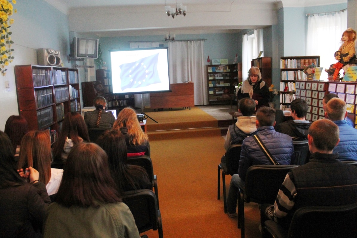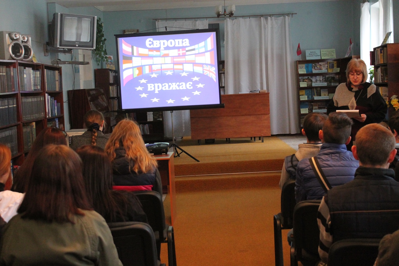 В рамках діяльності Пункту європейської інформації "Все про Європу", 27 березня 2017 року в читальному залі бібліотеки ім. М. Островського викладачі та учні Марганецького професійного ліцею здійснили мультимедійний екскурс "ЄВРОПА ВРАЖАЄ".