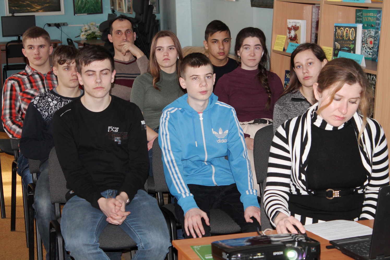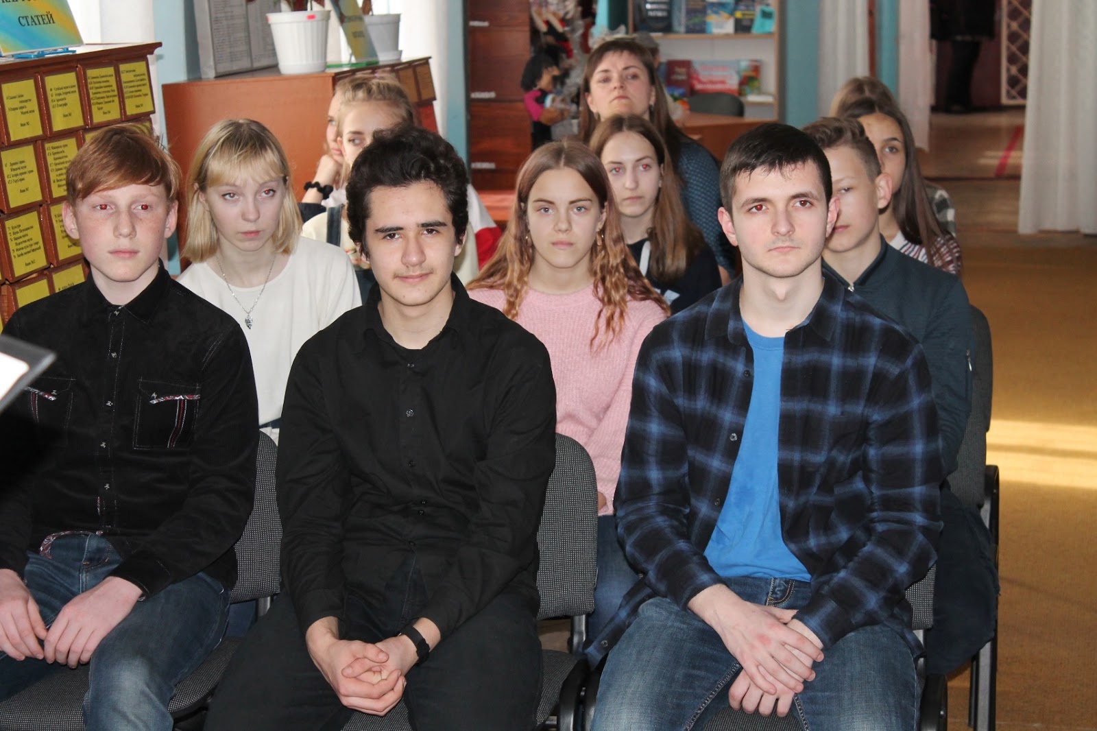 Присутні на літературному калейдоскопі до 125-ї річниці з дня народження Максима Рильського - учні та вчителі ЗОШ №3 - висловили вдячність за проведений захід та забажали зробити спільне фото в бібліотеці.