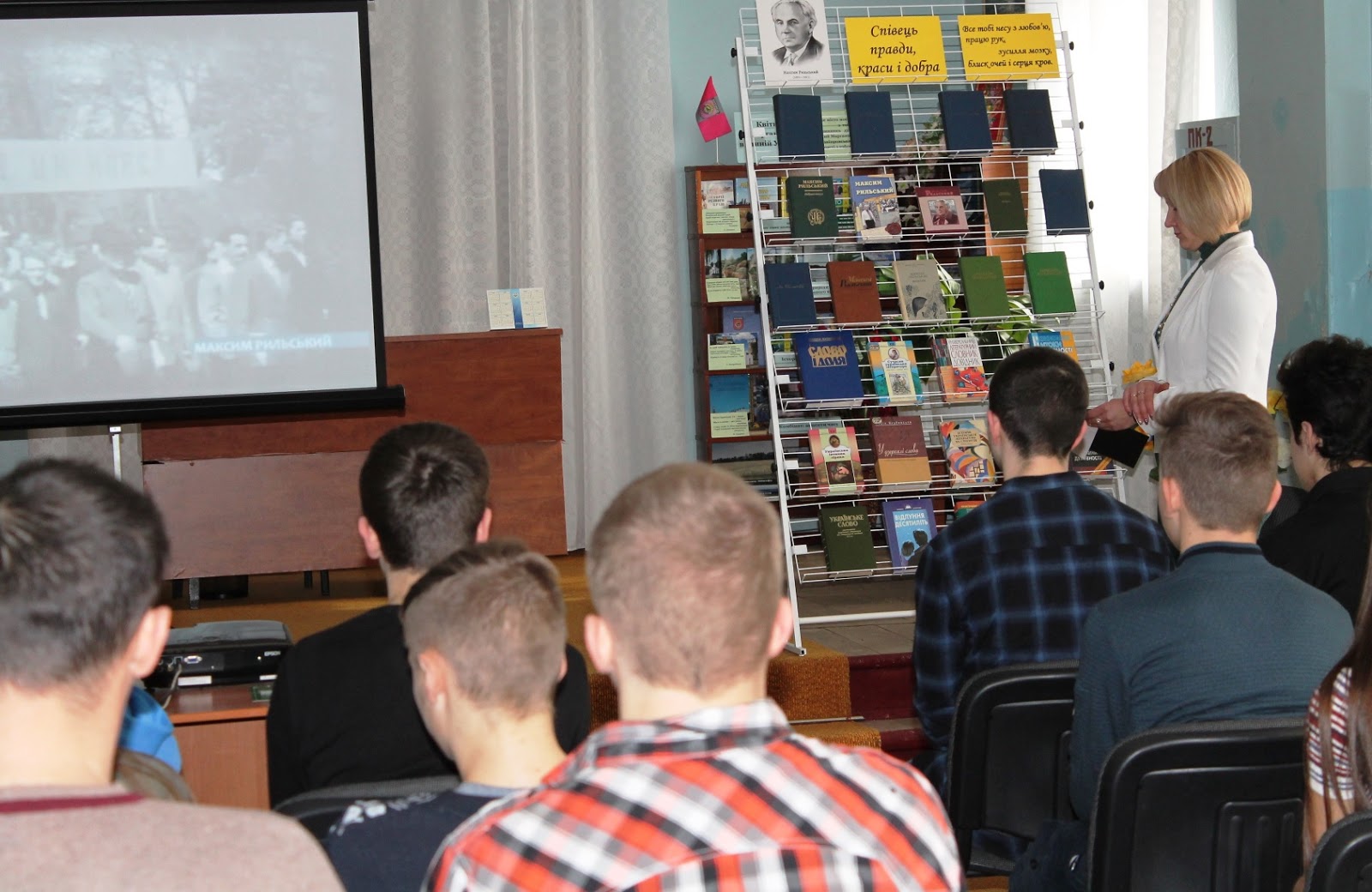 Про це на заході розповідала ведуча, бібліотекар центральної міської бібліотеки Світлана Рубан. Розповідь ведучої супроводжували та доповнювали слайд-презентація та відеоуривки про життя та творчість М.Т.Рильського, які підготувала провідний бібліограф ЦБС Ольга Забенько. Текст заходу підготувала бібліотекар ЦМБ Вікторія Жданова.