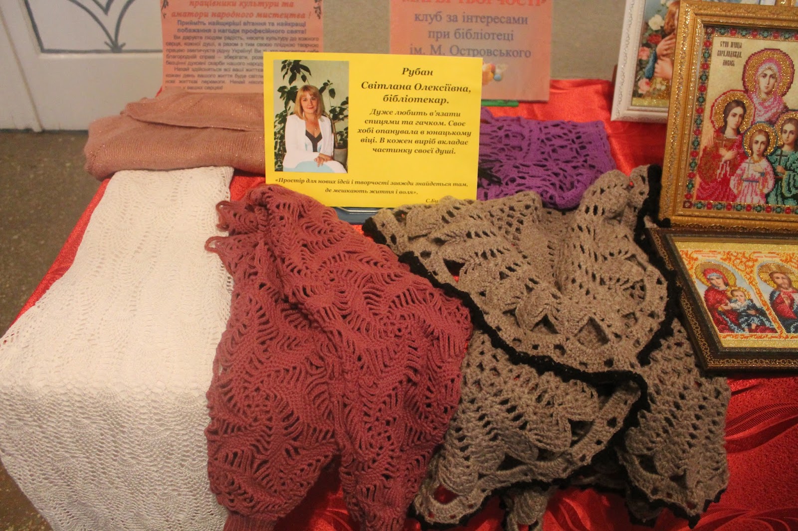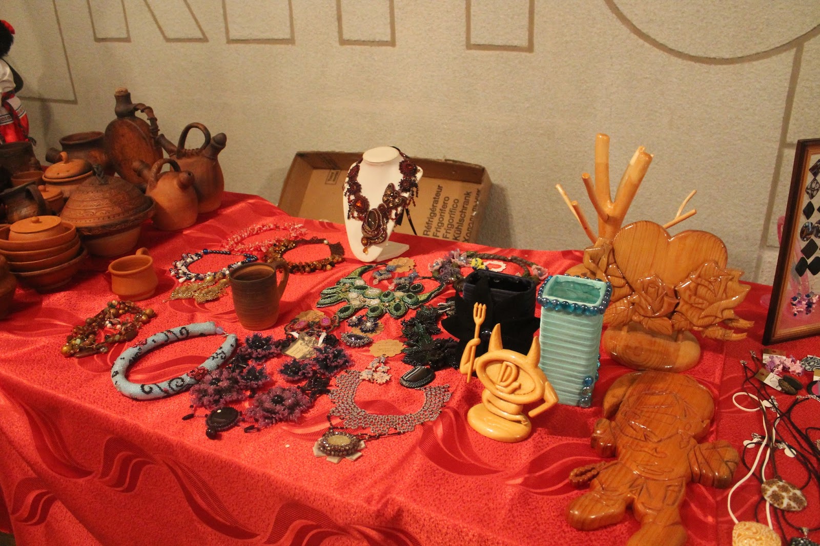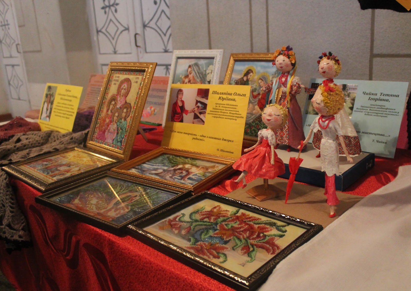 Погляд всіх присутніх зупиняла яскрава виставка народних майстрів міста, яка була організована в холі клубу. На ній були представлені роботи С.В.Шрамчевської, О.В.Кириленка, В.В.Аришевої, А.О.Худімової, а також роботи майстринь клубу за інтересами «Магія творчості", який діє при центральній міській бібліотеці ім.М.Островського: О.Ю.Шаляпіної, С.О.Рубан, Т.І.Чайки та В.М.Шагойко.
