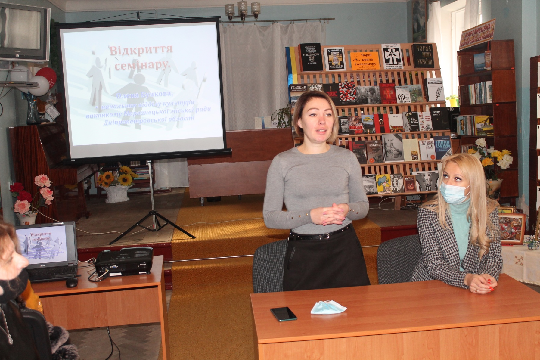 Захід своїм виступом відкрила начальник відділу культури виконкому Марганецької міської ради Олена Буякова. КЗ «Публічна бібліотека» Марганецької територіальної громади є структурним підрозділом відділу культури. За сприяння керівництва відділу культури бібліотеки поступово розвиваються і змінюються на краще. Під час свого виступу Олена Михайлівна побажала плідної та успішної роботи всім учасникам семінару. Також подарувала бібліотечним фахівцям солодкі гостинці. В ході семінару взяла участь головний спеціаліст відділу культури виконкому Яна Макарова.