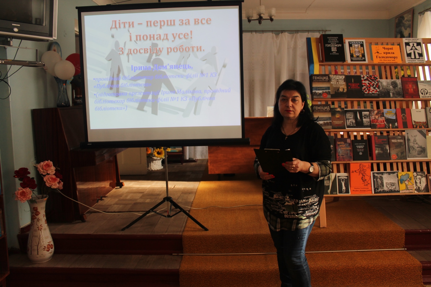 Напрацюваннями з досвіду роботи з користувачами-дітьми поділилася Ірина Дем’янець, провідний бібліотекар бібліотеки-філії №1 КЗ «Публічна бібліотека». Вона виступила з темою «Діти – перш за все і понад усе!». Презентацію до виступу підготувала Ірина Малікова, провідний бібліотекар бібліотеки-філії №1 КЗ «Публічна бібліотека».