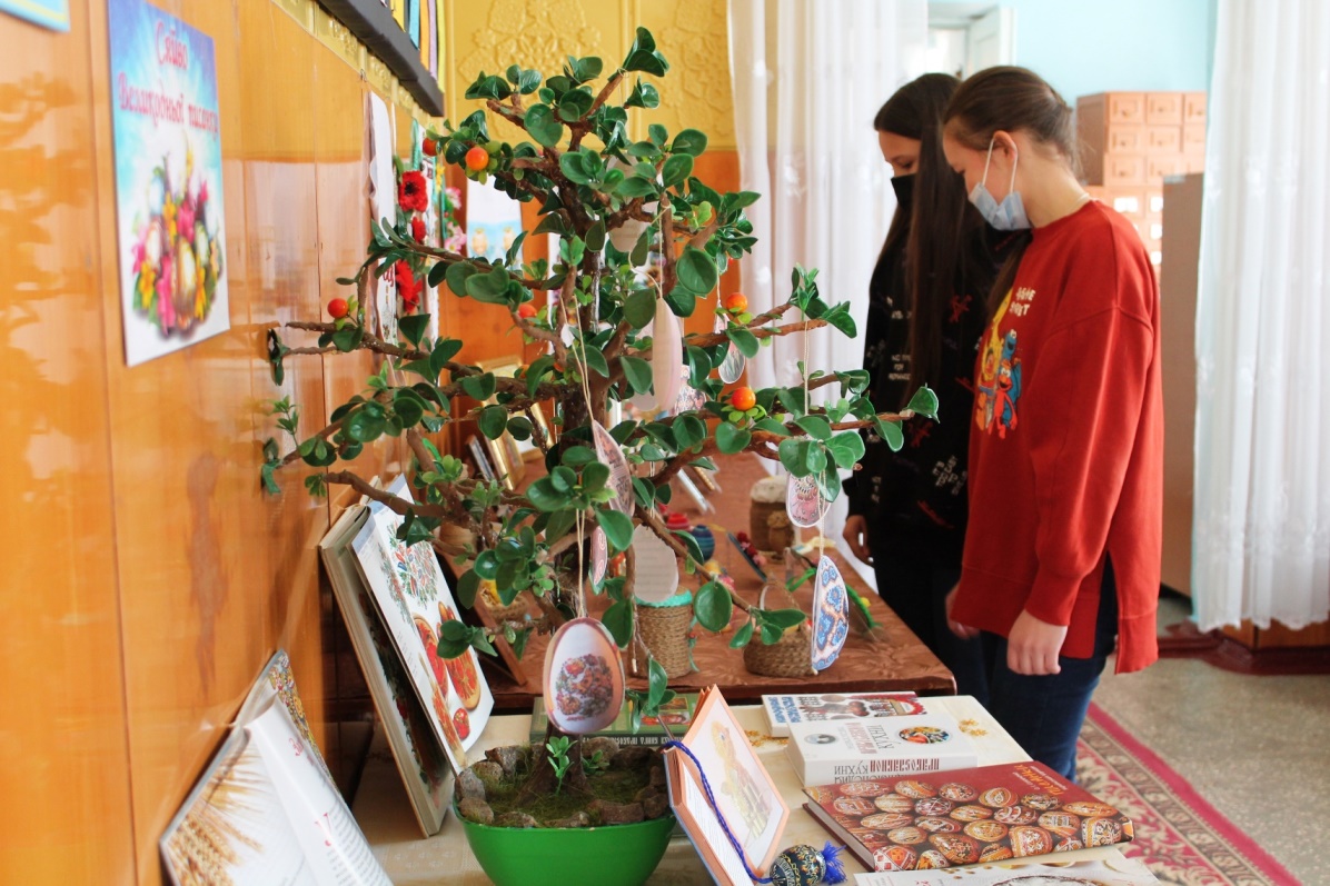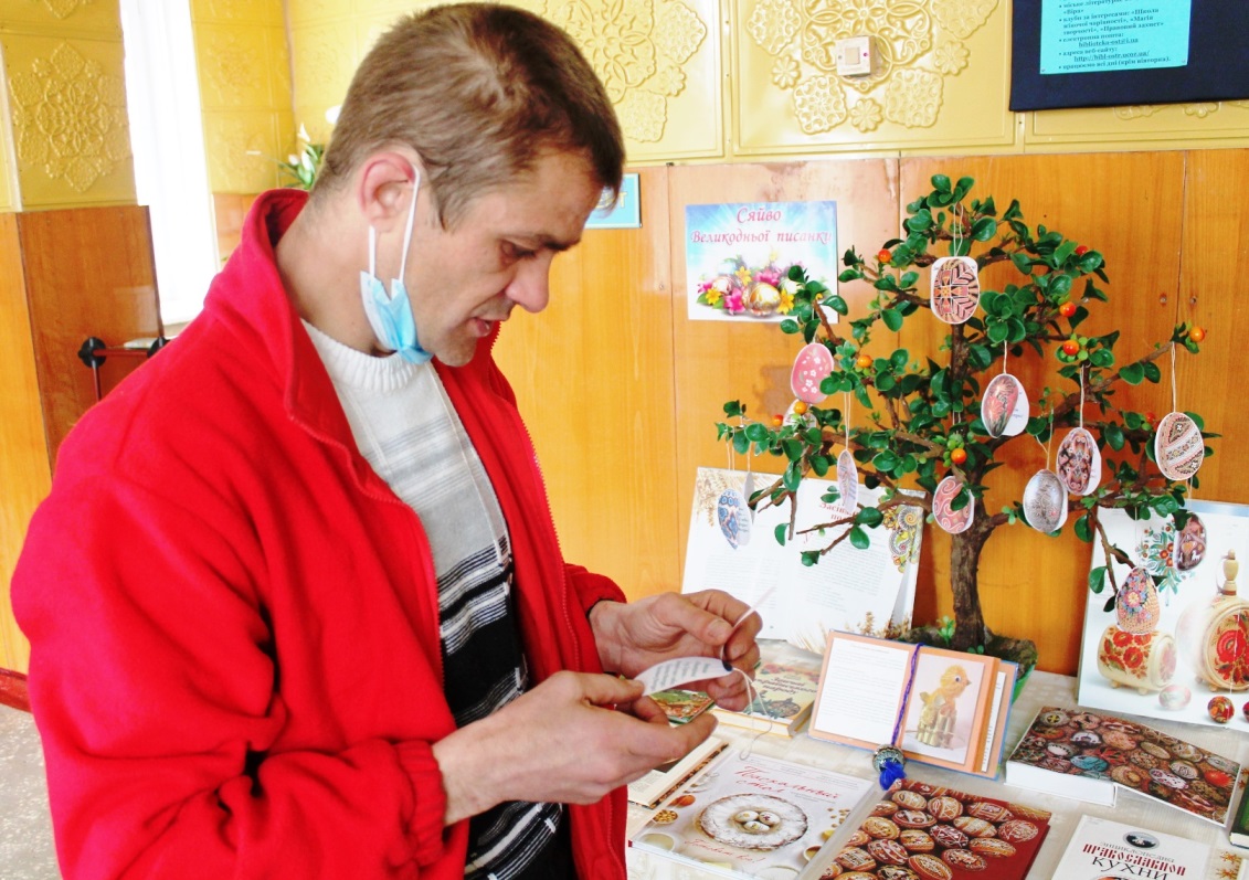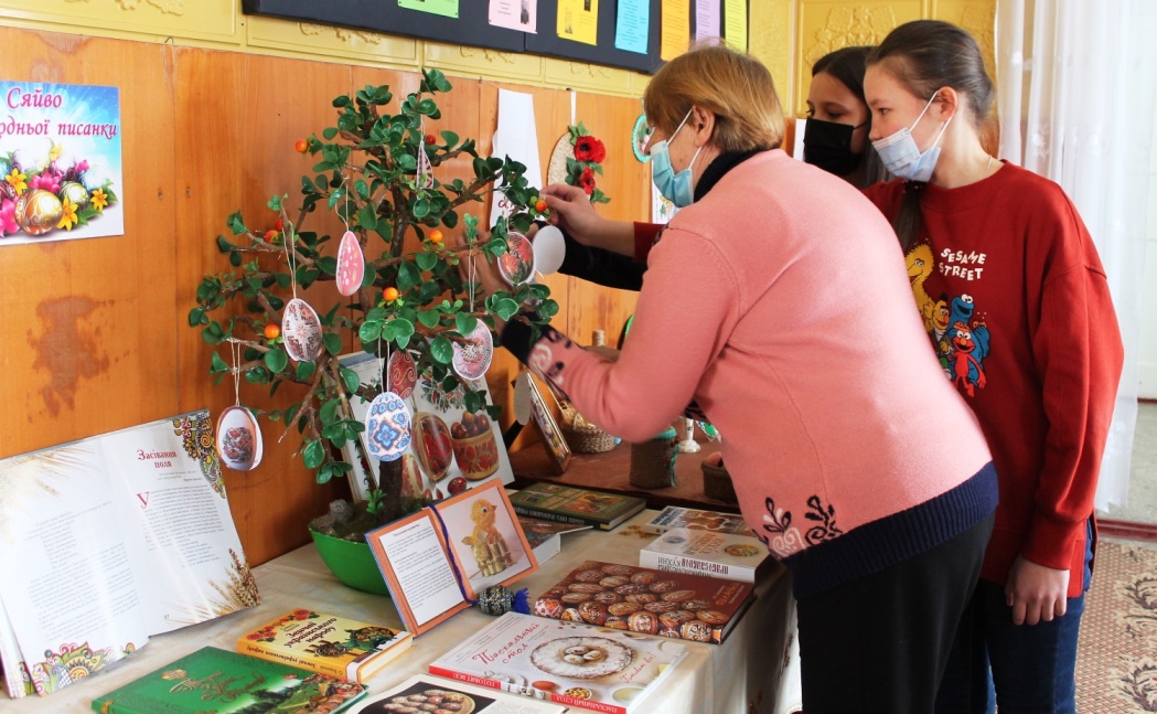 Працівники бібліотеки підготували вітальні листівки у вигляді писанок з прихованими в них привітаннями і побажаннями до свята. Кожний з читачів міг зняти собі в подарунок листівку-писанку, прочитати побажання (адже вони всі різні) та забрати собі на згадку.